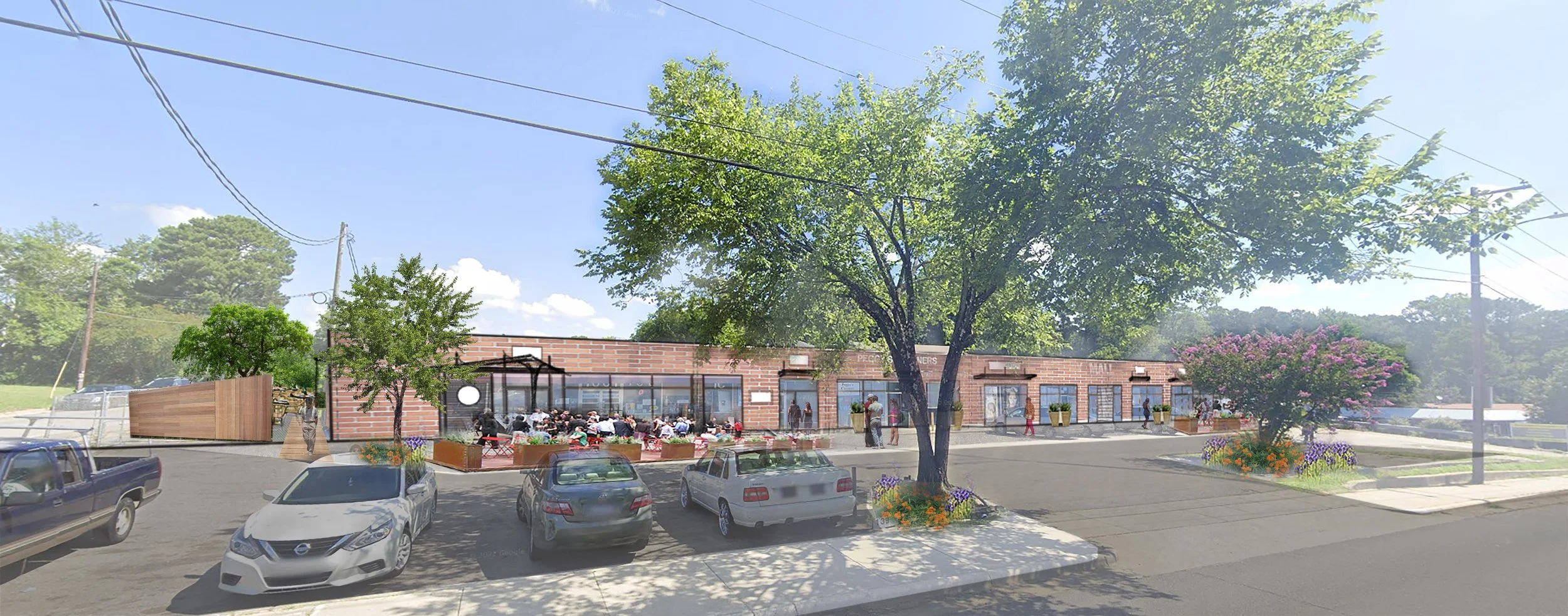 bringing new life to a midcentury retail strip center with several new seating areas replacing parking spaces and upgraded storefronts to create new entrances to smaller retail suites. along planned bus rapid transit route.